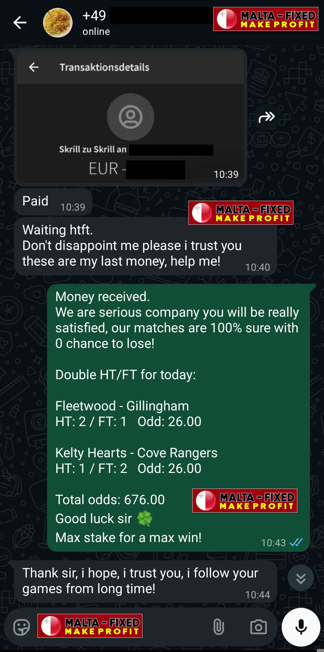 Here the payment for the fixed matches is processed before the start of the fixed matches. If you want to make a profit with our fixed matches you must first pay and then get your matches. Malta-fixed is the best site for the sale of fixed matches. Our double HT / FT fixed matches are 100% sure & safe. We have info directly from the club and are very strong sources. Also the odds are good for earn high money. You will easily make money with us, for more info contact us.