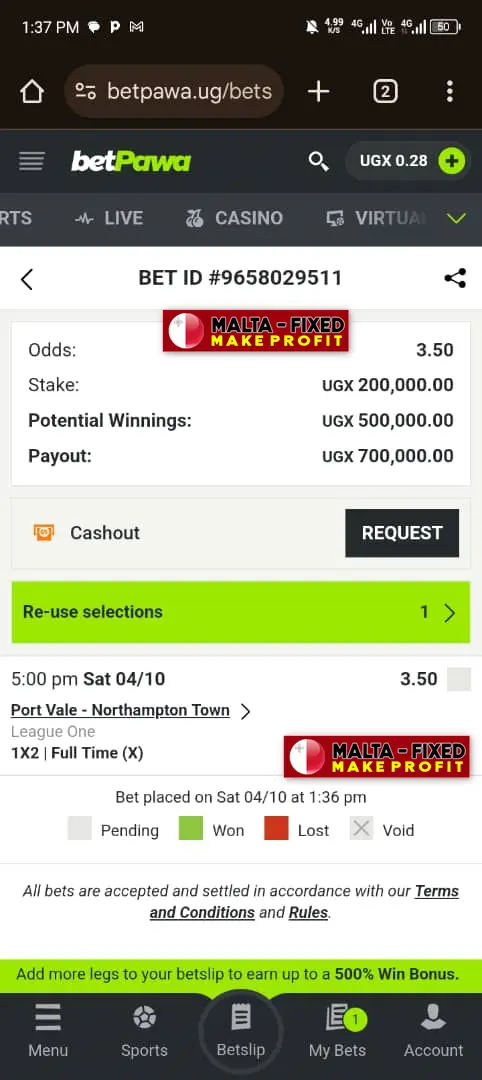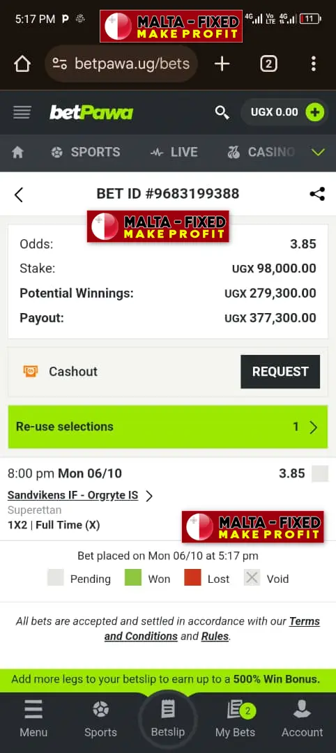 If you are not happy with small odds, this offer is just for you. Malta-fixed can offer you the best VIP tickets since we work with highly reliable sources and we offer you 4 combined fixed games. These VIP fixed matches are 100% sure & s afe. You can make a good profit with a small investment of money. You will easily make money with us, for more information see our offer. With us and our offers here your profit and success will be guaranteed. You need a few steps to become rich with us, and these are: Pay here, get your fixed matches after your payment and finall enjoy the victory.