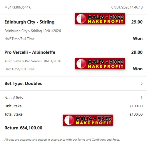 Here the payment for the fixed matches is processed before the start of the fixed matches. If you want to make a profit with our fixed matches you must first pay and then get your matches. Malta-fixed is the best site for the sale of fixed matches. Our double HT / FT fixed matches are 100% sure & safe. We have info directly from the club and are very strong sources. Also the odds are good for earn high money. You will easily make money with us, for more info contact us.