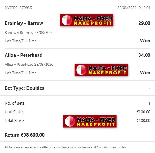 Hello everyone. Welcome to our web site first. It is my honor and pleasure to be able to work with you. Malta-fixed is a verified web site where you can find 100 % sure soccer fixed matches. You’re right here in the right place to get your fixed matches. We have put together a team of world-class professionals who are fully committed to their work and will do everything in their power to make you money with our fixed matches. Don’t miss this chance to earn with our fixed matches everytime. This is your opportunity to make big money, Sincerely, the team of MALTA-FIXED.COM