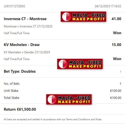 Here the payment for the fixed matches is processed before the start of the fixed matches. If you want to make a profit with our fixed matches you must first pay and then get your matches. Malta-fixed is the best site for the sale of fixed matches. Our double HT / FT fixed matches are 100% sure & safe. We have info directly from the club and are very strong sources. Also the odds are good for earn high money. You will easily make money with us, for more info contact us.
