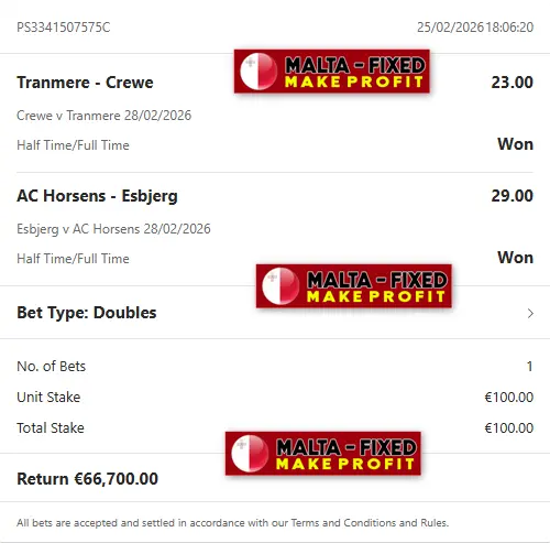 Here the payment for the fixed matches is processed before the start of the fixed matches. If you want to make a profit with our fixed matches you must first pay and then get your matches. Malta-fixed is the best site for the sale of fixed matches. Our double HT / FT fixed matches are 100% sure & safe. We have info directly from the club and are very strong sources. Also the odds are good for earn high money. You will easily make money with us, for more info contact us.