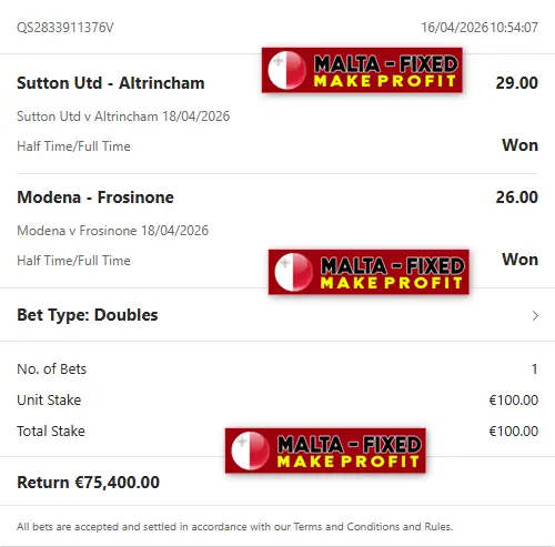 Here the payment for the fixed matches is processed before the start of the fixed matches. If you want to make a profit with our fixed matches you must first pay and then get your matches. Malta-fixed is the best site for the sale of fixed matches. Our double HT / FT fixed matches are 100% sure & safe. We have info directly from the club and are very strong sources. Also the odds are good for earn high money. You will easily make money with us, for more info contact us.