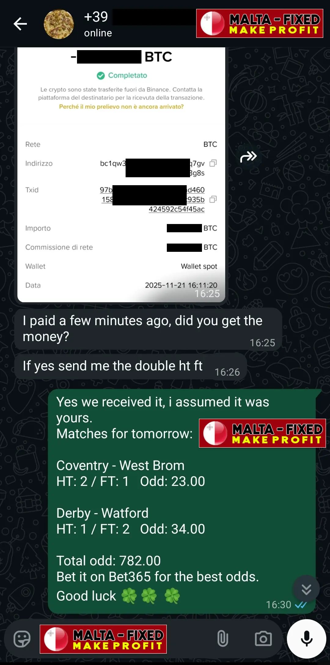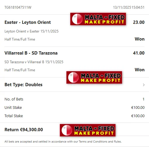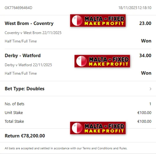 Here the payment for the fixed matches is processed before the start of the fixed matches. If you want to make a profit with our fixed matches you must first pay and then get your matches. Malta-fixed is the best site for the sale of fixed matches. Our double HT / FT fixed matches are 100% sure & safe. We have info directly from the club and are very strong sources. Also the odds are good for earn high money. You will easily make money with us, for more info contact us.
