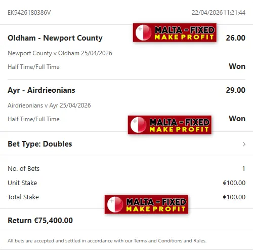 Odds on Double Ht/Ft for 25/04/2026 is 754.00 | Status: WON